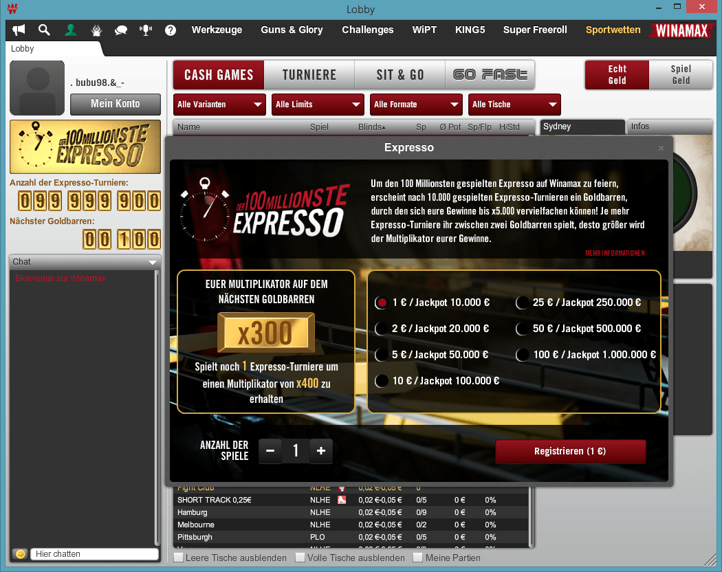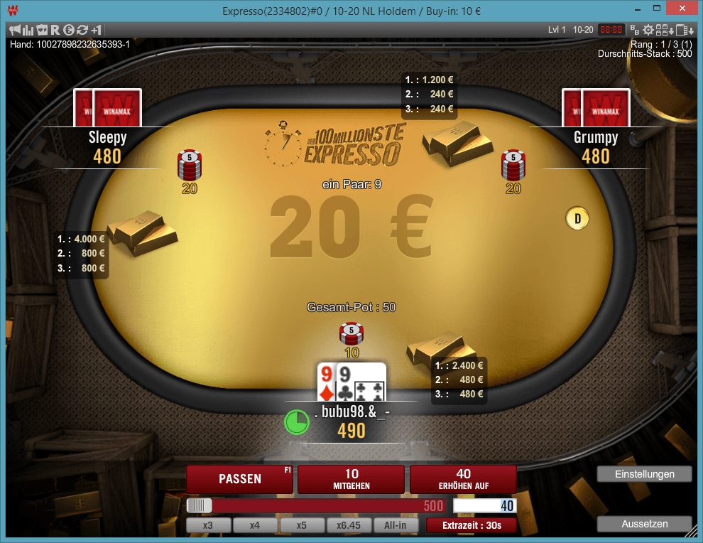 Die Expresso-Turniere werden je nach Buy-in belohnt. Wenn ihr einen Expresso für 2 € gespielt habt, so zählt dieser nicht mit für euren Multiplikator, wenn ihr einen einen Goldbarren beim Starten eines Expresso-Turniers für 10 € erwischt.