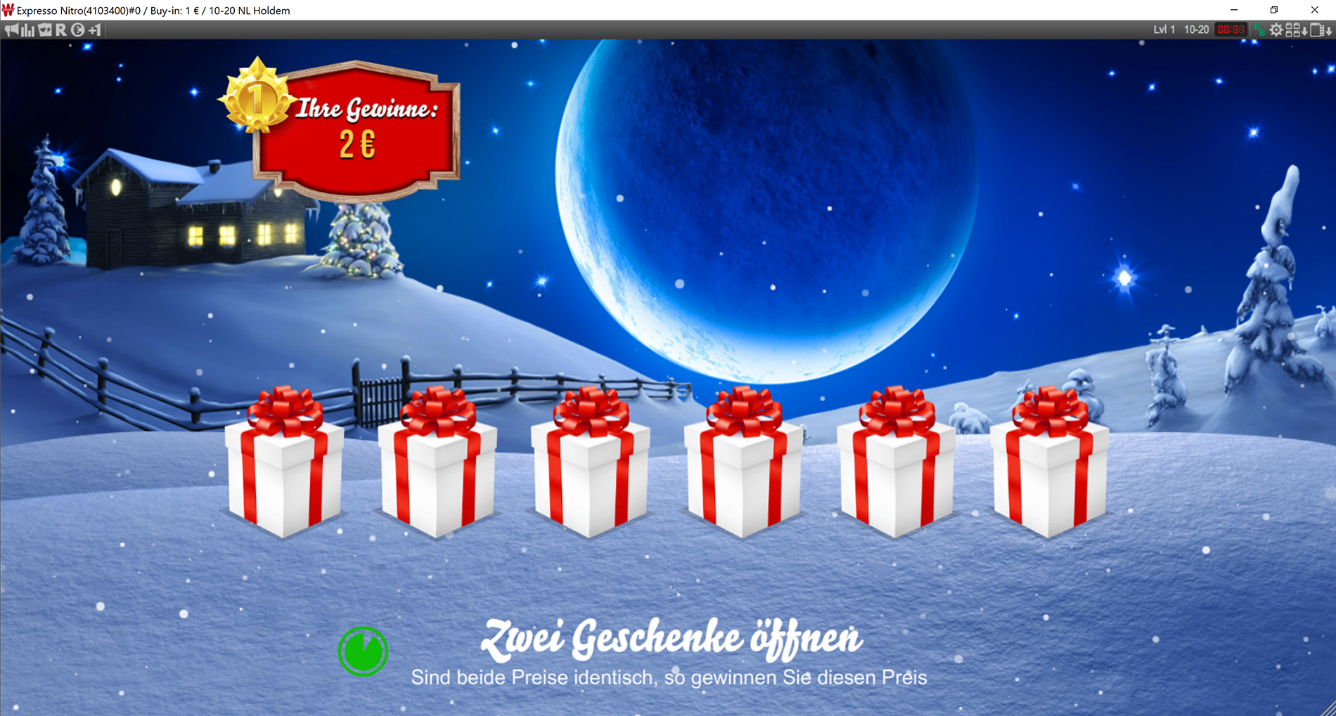 Bei der nächsten Santa-Ziehung in einem Expresso mit demselben Buy-in, könnt ihr ein zusätzliches Geschenk öffnen, sofern ihr bei den ersten beiden Versuchen nicht zwei identische Geschenke gefunden habt.