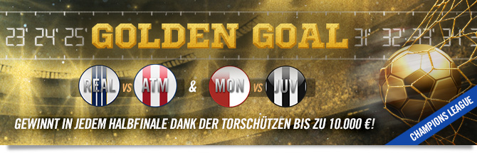Ronaldo, Griezman, Higuain, Falcao, Mbappé… In den Halbfinals der Champions League fehlt es nicht an überragenden Torschützen. Sie garantieren aber nicht nur Nervenkitzel und ein großes Spektakel, sie können euch auch viel Geld einbringen: 10.000 € in jedem Spiel! Entscheidet euch also für euren Torschützen und die Minute, in der er trifft und erzielt ein Golden Goal!