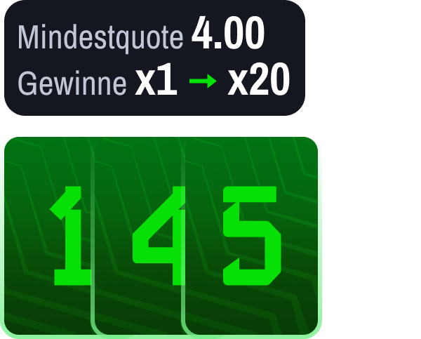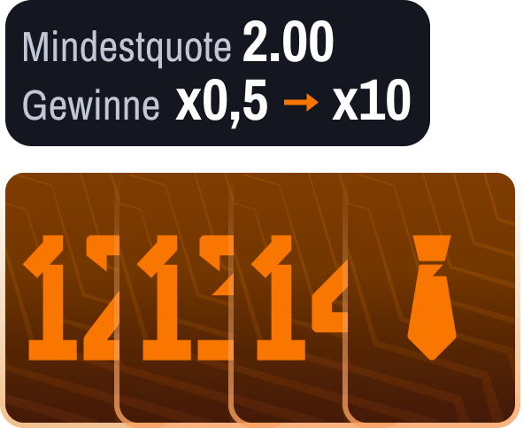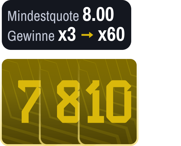 Jede Spielergruppe entspricht einer vordefinierten Mindestquote. Um eine Karte zu gewinnen, müsst ihr eine Wette mit mindestens der hier angegebenen Mindestquote gewinnen. Beispiel: Um die Karte „Der Kapitän“ zu gewinnen, müsst ihr eine Wette mit einer Mindestquote von 6,00 gewinnen. Sobald alle drei Karten der Gruppe gewonnen wurden, beträgt die Belohnung das 2-fache des Referenzeinsatzes in Freebets, der mithilfe des Zufallskoeffizienten bis zu x20 multipliziert werden kann.