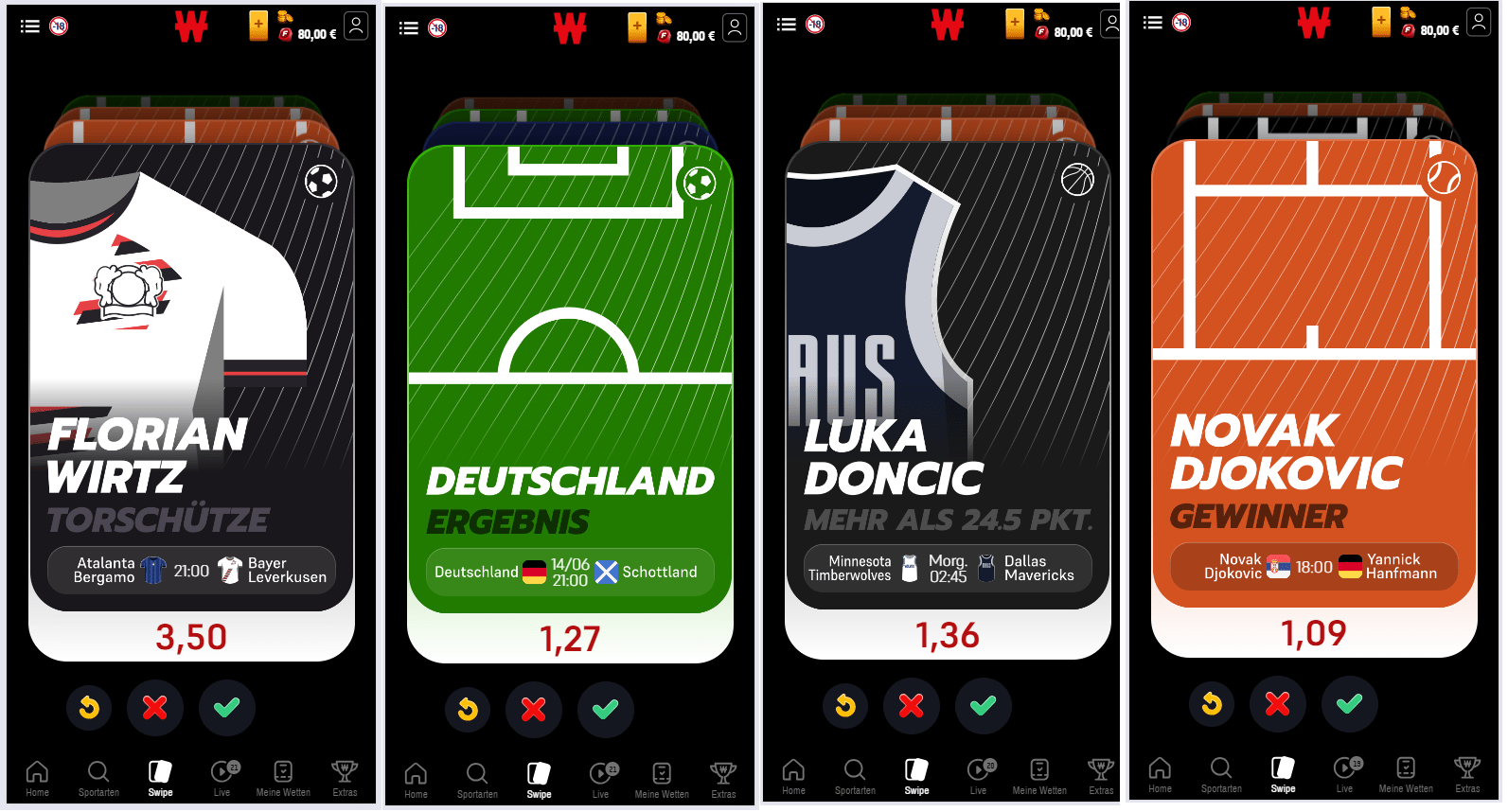 Nichts ist einfacher, als eure Wahl zu treffen: Nicht von der Wette überzeugt? Ihr könnt sie mit einem Swipe nach links überspringen. Ihr habt ein gutes Gefühl? Wählt eure Wette aus, indem ihr nach rechts swipt! Bereut ihr etwas? Mit dem kleinen gelben Pfeil könnt ihr zur vorherigen Auswahl zurückkehren.
